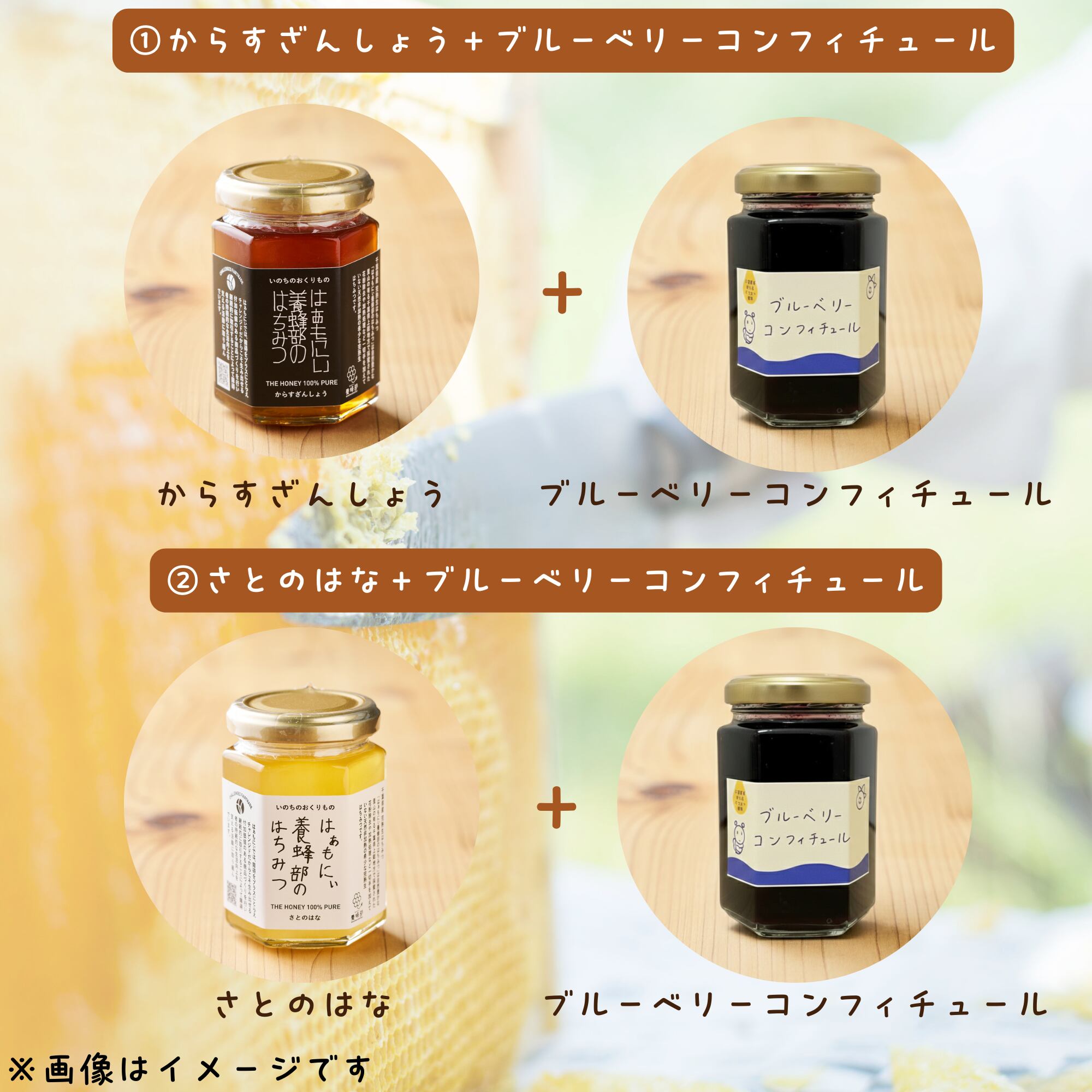 本商品は、はぁもにぃ養蜂部を代表する2種類のはちみつと、お菓子工房はぁもにぃから提供されるブルーベリーコンフィチュールを選んでギフトボックスに詰め合わせたセットです。